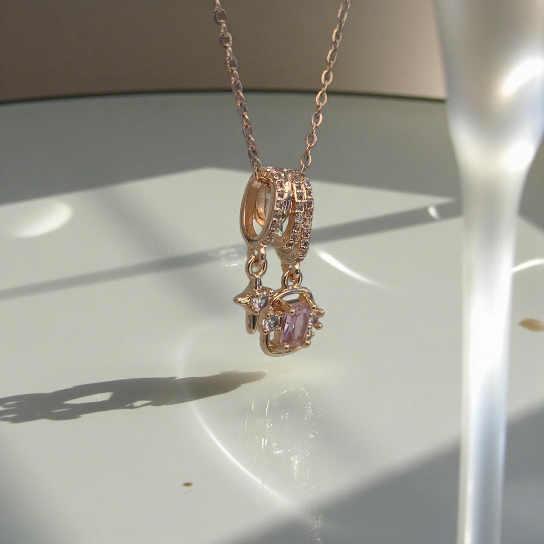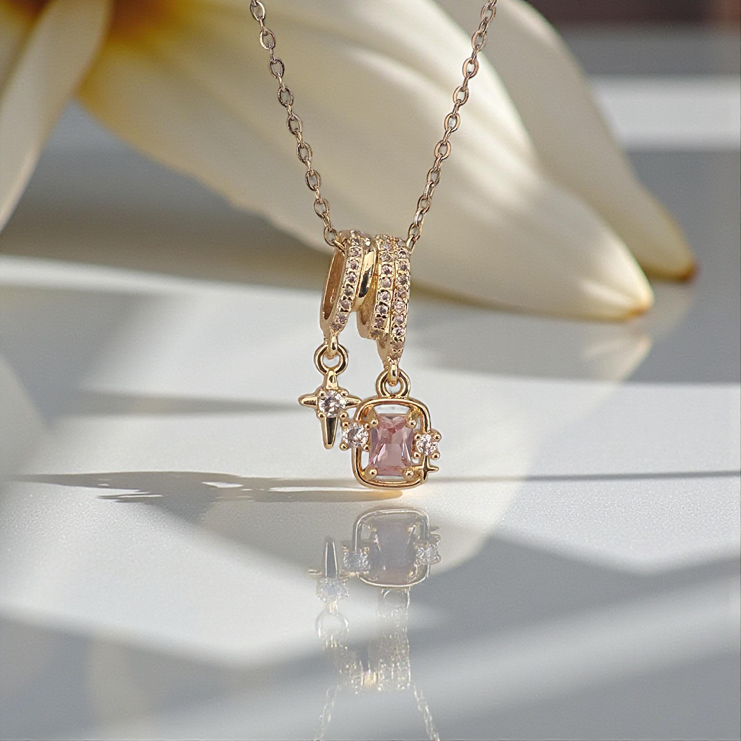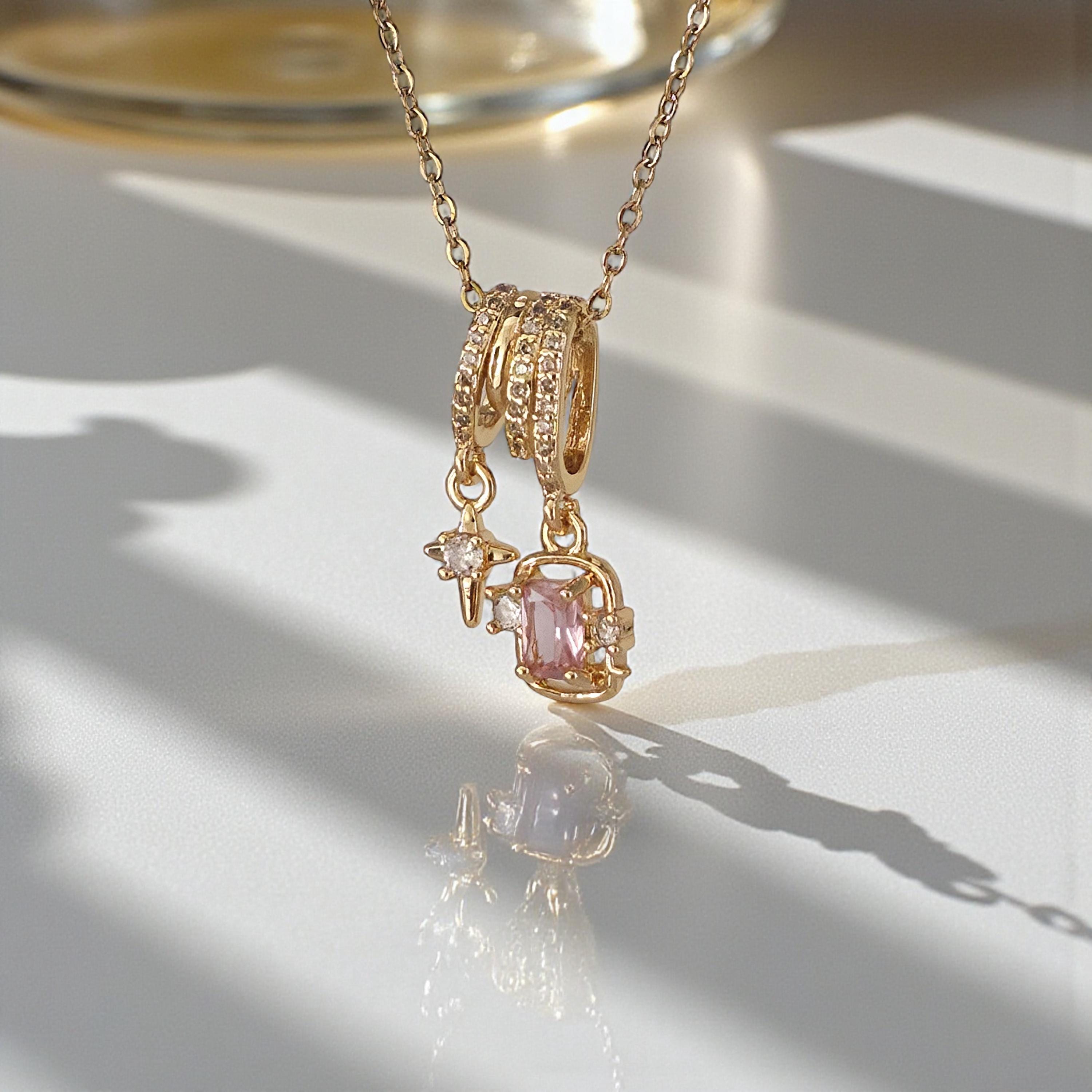 Gold Charm Necklace — Pink Topaz Birthstone Jewelry, Galentine Gift for Her