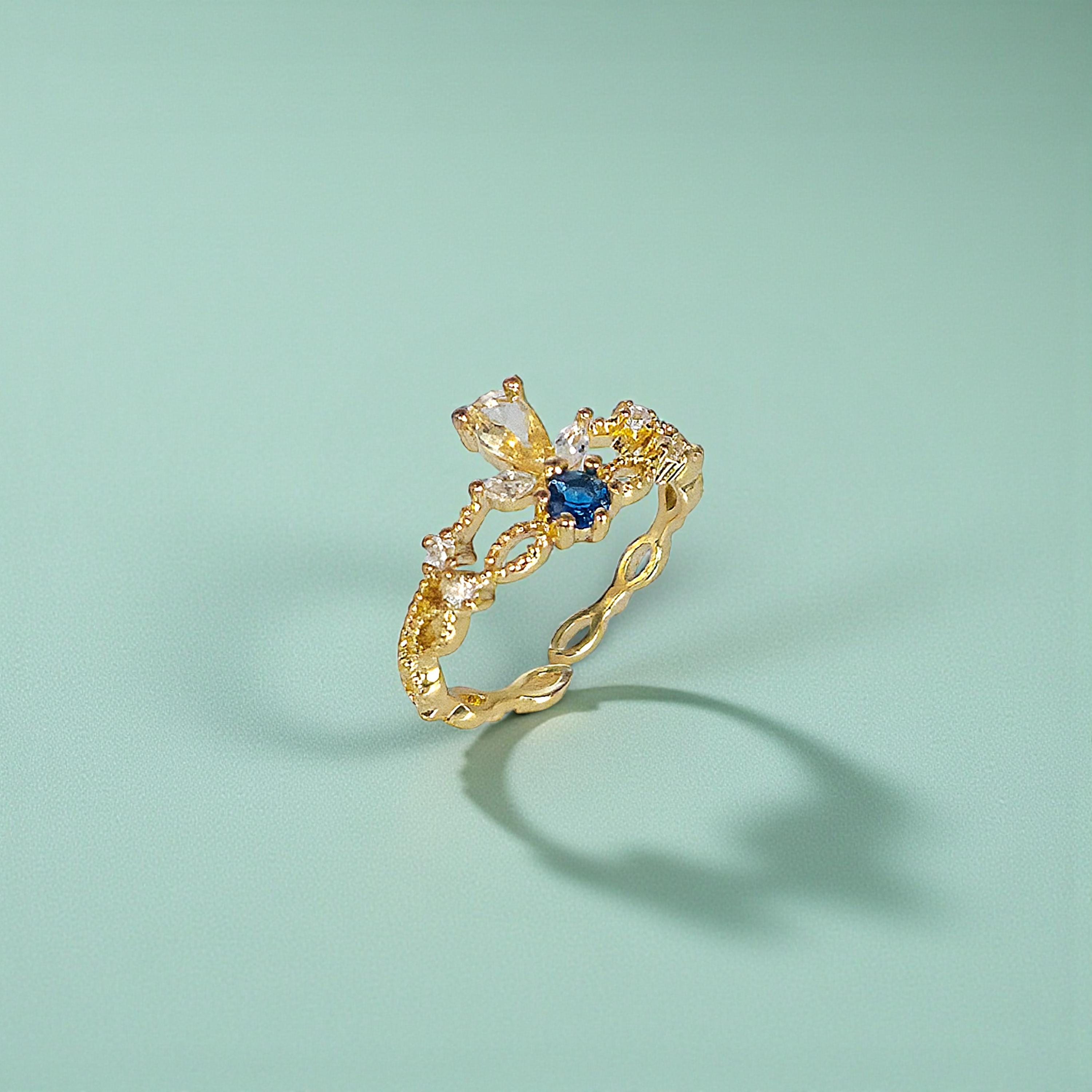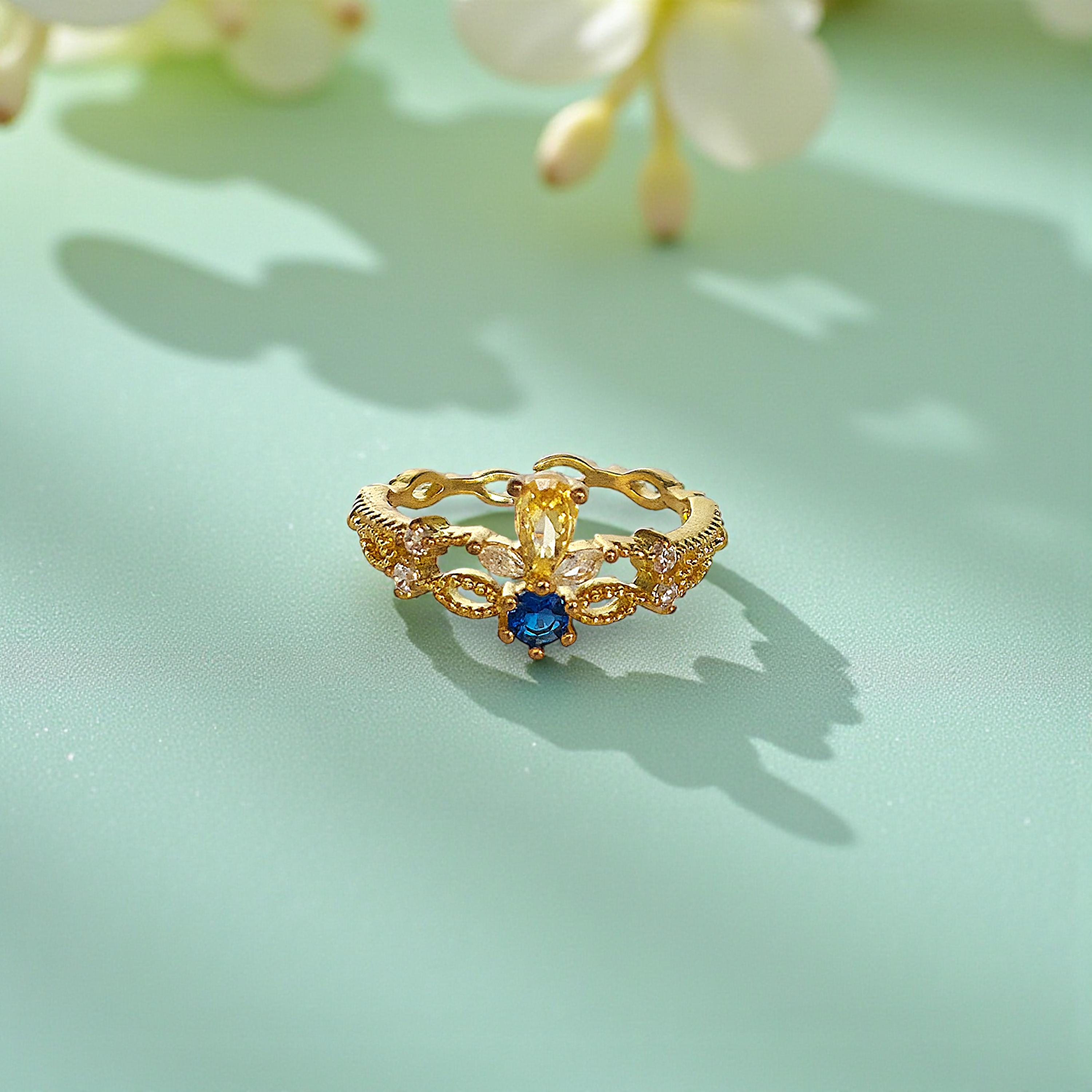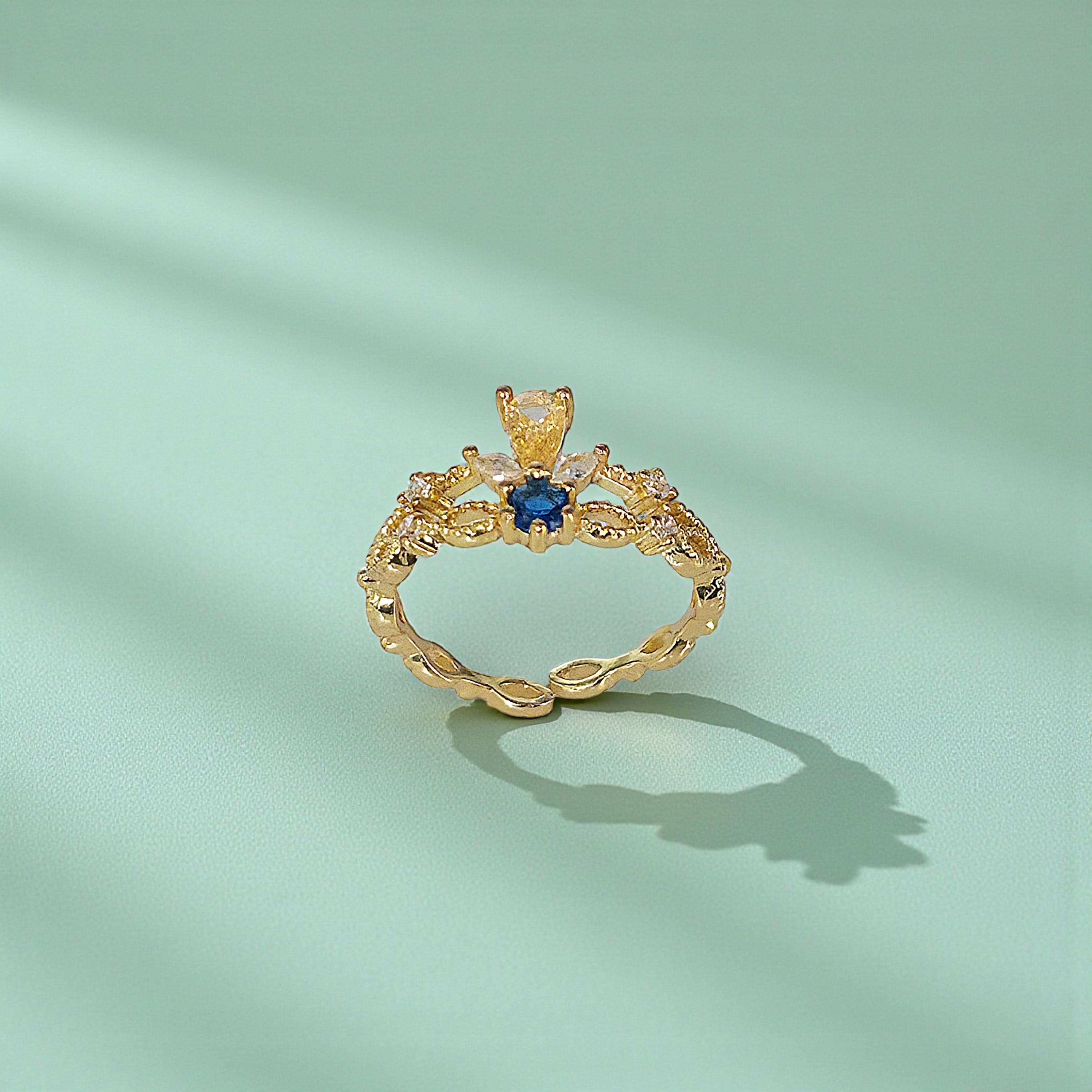 This 14K Gold Filled Dainty Sapphire Crown Ring features an adjustable ring band, vintage ring detailing, and a sapphire ring centerpiece. The crown ring silhouette with tiara ring elegance gives it a princess ring appeal, while Victorian jewelry influences add timeless charm. Designed as a dainty ring for everyday wear, it can be styled as a statement ring or layered as a stacking ring. Perfect as a promise ring, anniversary gift, birthday gift, Valentine’s or Galentine’s surprise, this sapphire crown ring blends classic vintage ring style with modern versatility.