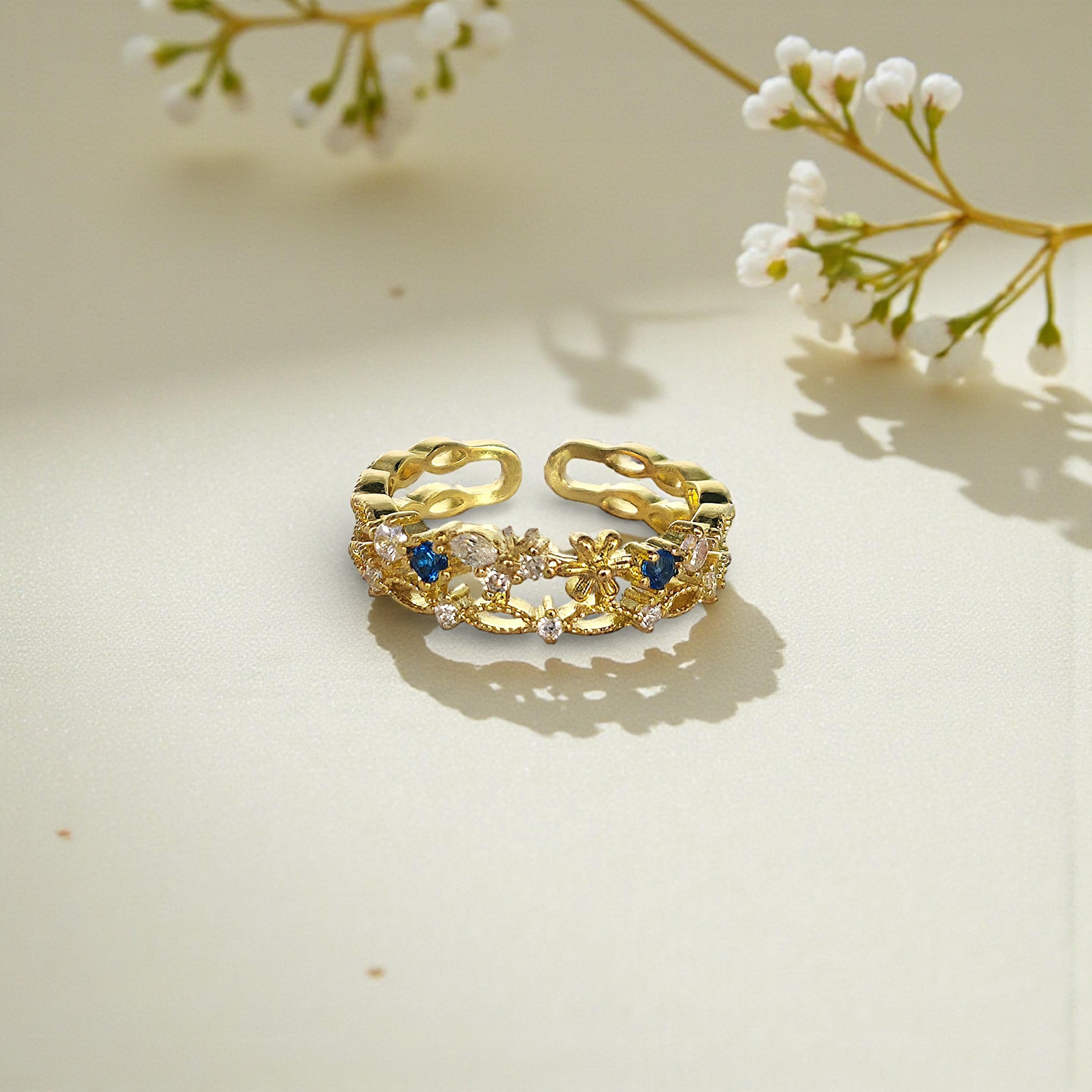Gold Filled Flower Ring — Adjustable Sapphire Floral Jewelry - Bridesmaid Gift