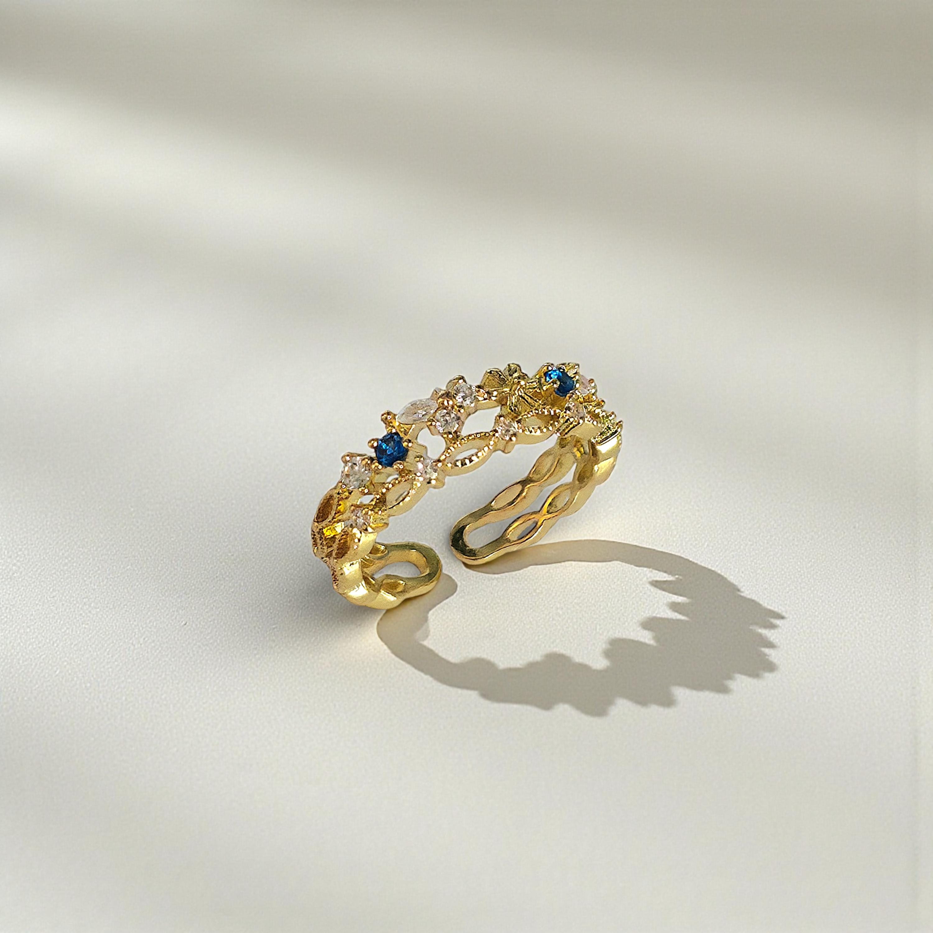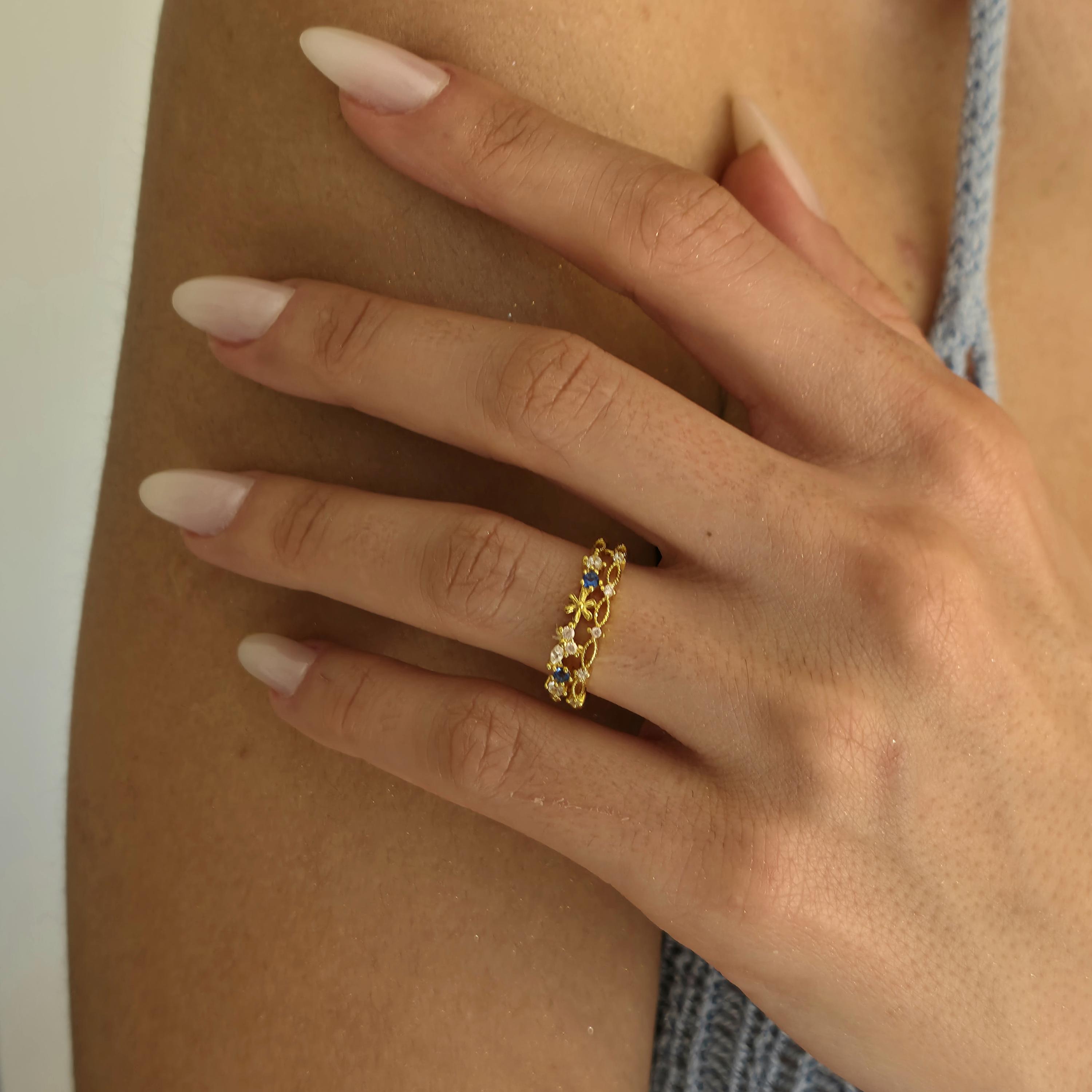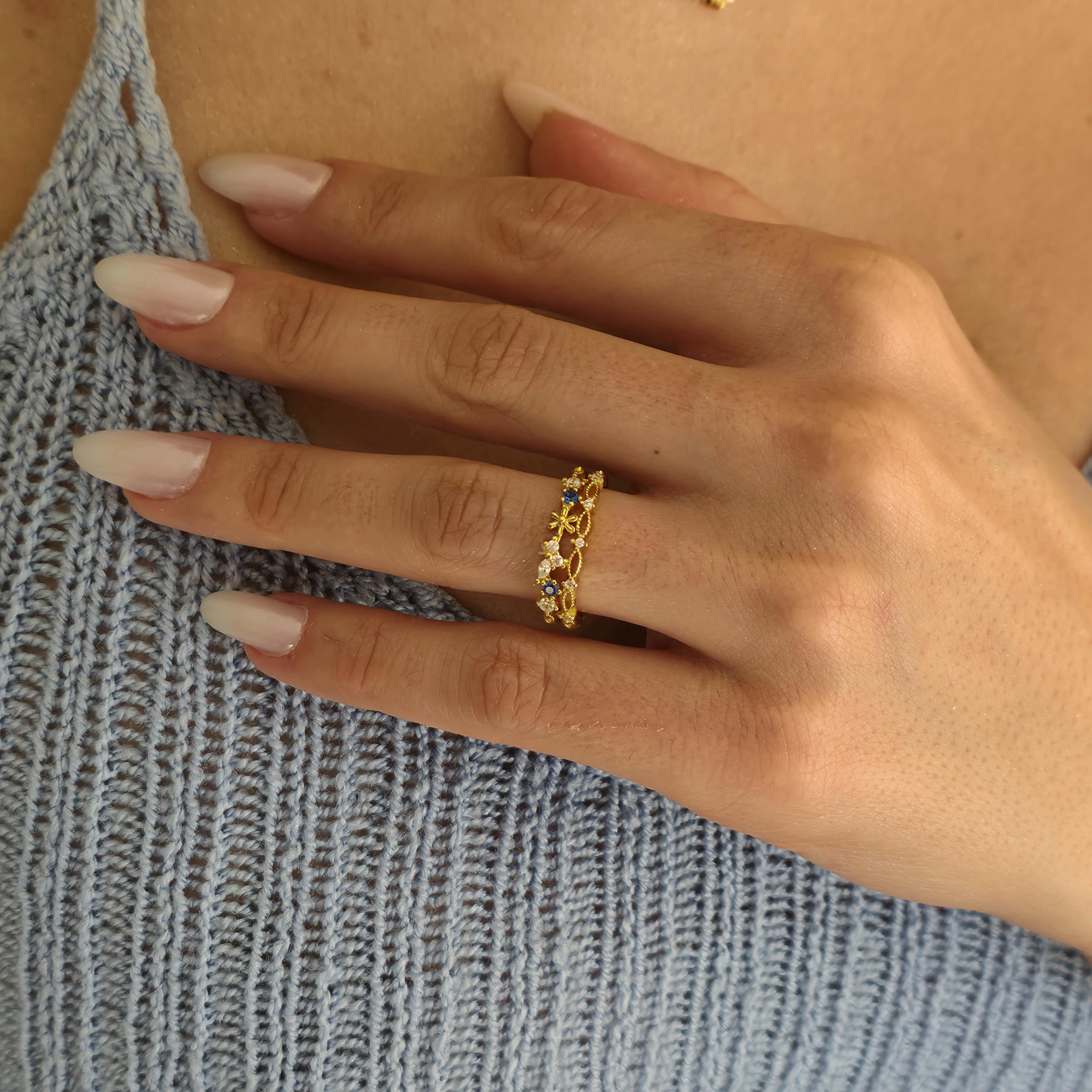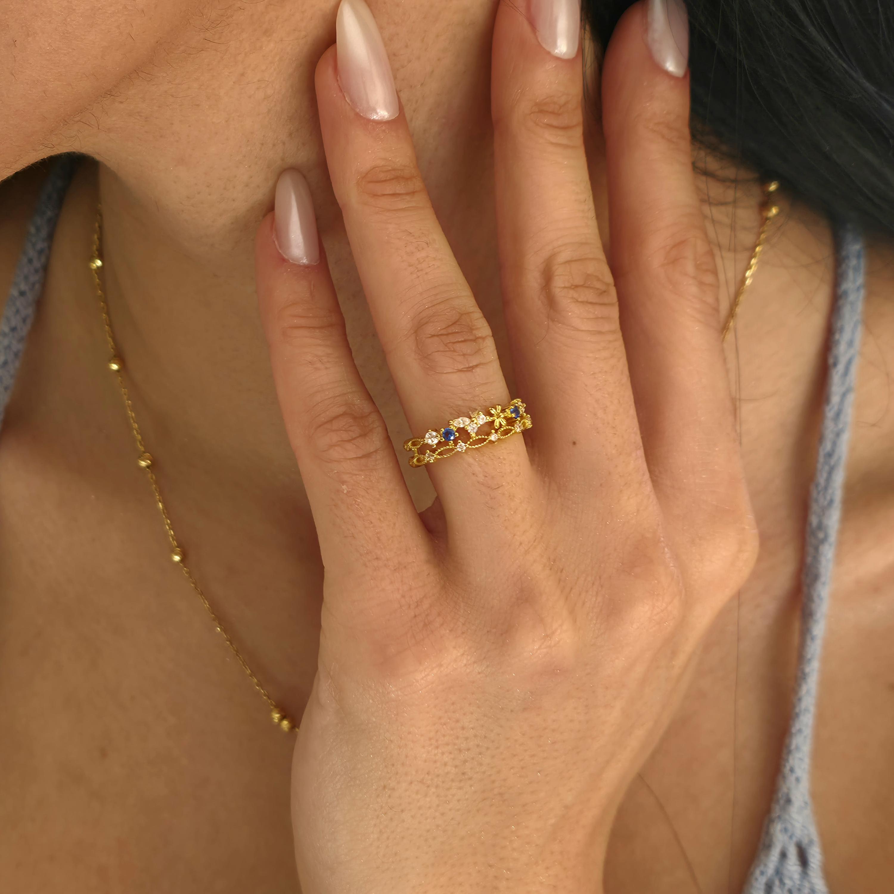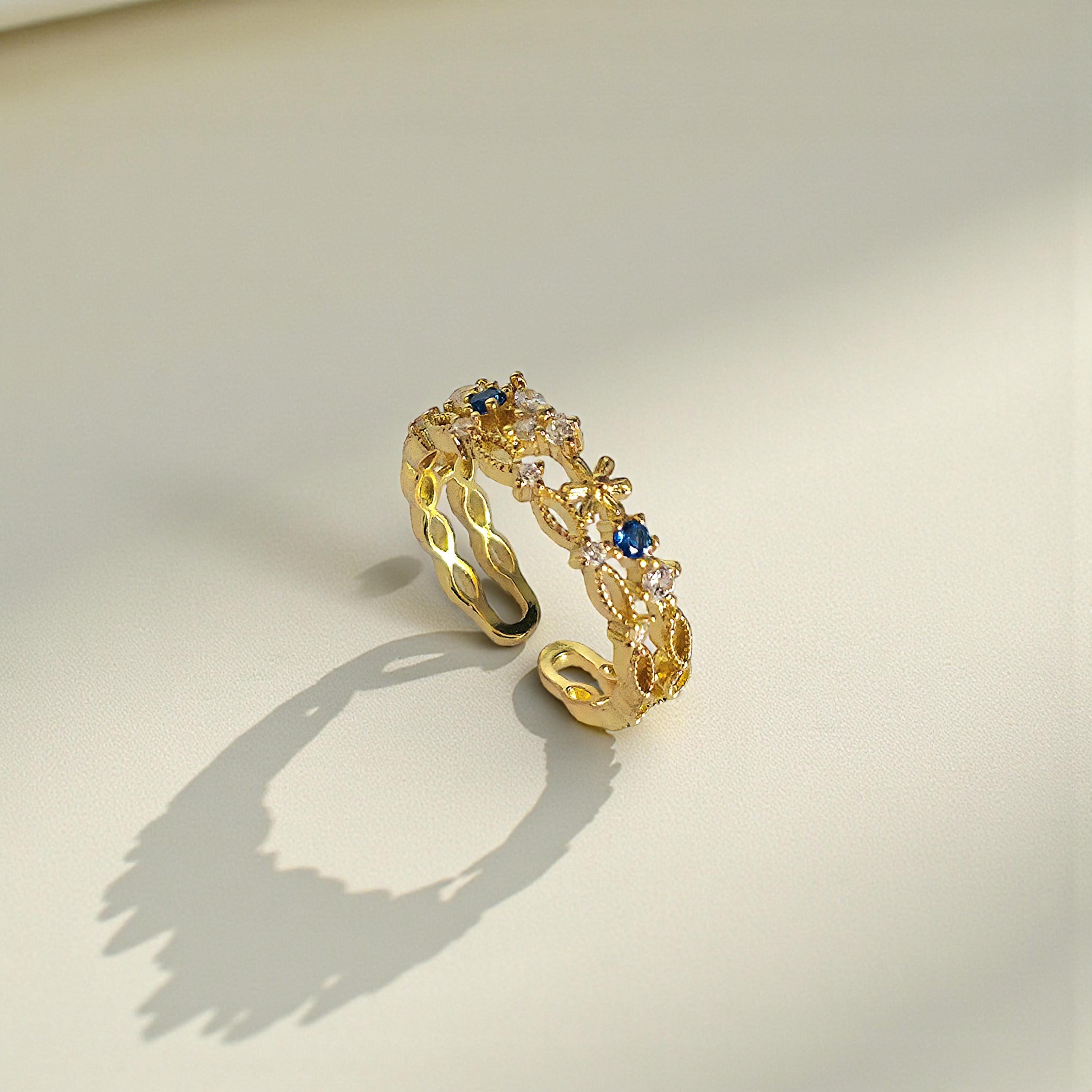 This Gold Filled Flower Ring features an adjustable ring with a sapphire centerpiece and delicate floral jewelry detailing. The flower ring silhouette blends princess ring charm with victorian jewelry elegance, while the dainty gold finish makes it perfect for everyday wear.